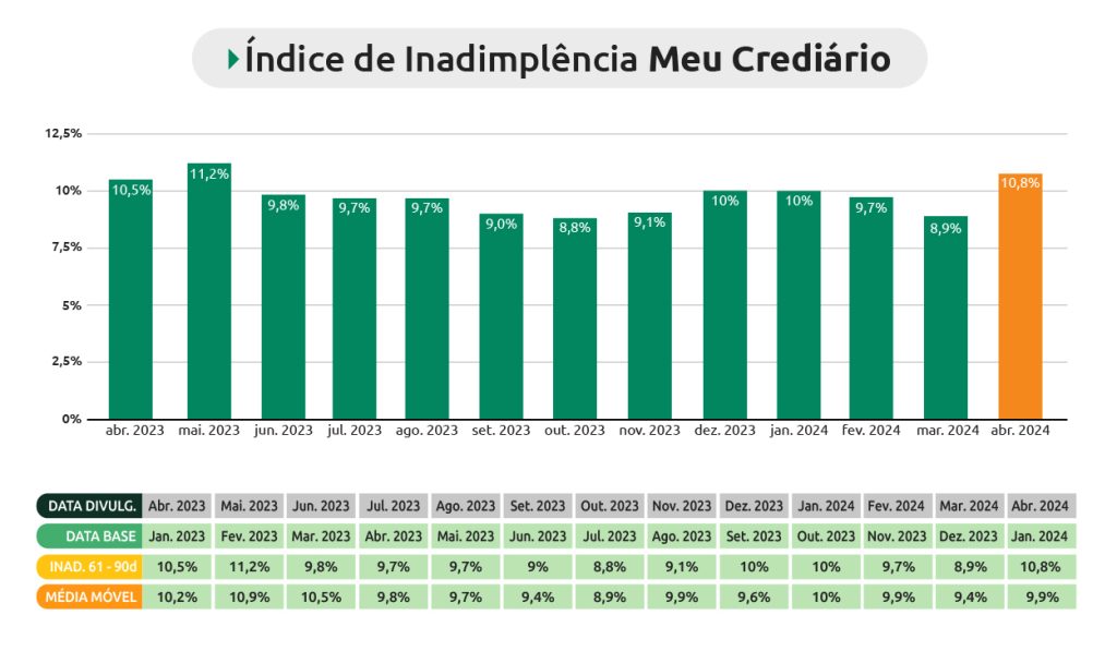 O Índice Meu Crediário, calculado com grau de confiança de 95% e margem de erro de 3%, é uma referência confiável para o varejo brasileiro, pois analisa redes de lojas de todo país. Ele oferece insights valiosos para que gestores do varejo ajustem suas estratégias e enfrentem os desafios econômicos com maior segurança. Acesse aqui os números da inadimplência dos meses anteriores.
