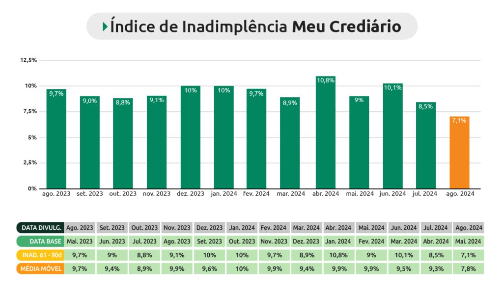 O índice de inadimplência do Meu Crediário, referente às vendas realizadas em abril de 2024 e vencidas em julho, trouxe boas notícias para o varejo brasileiro: a inadimplência caiu para 8,5%.