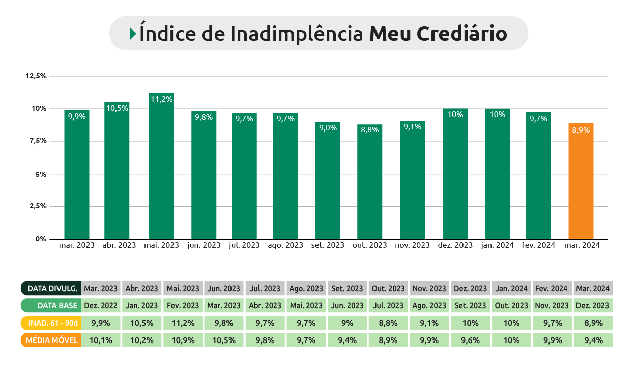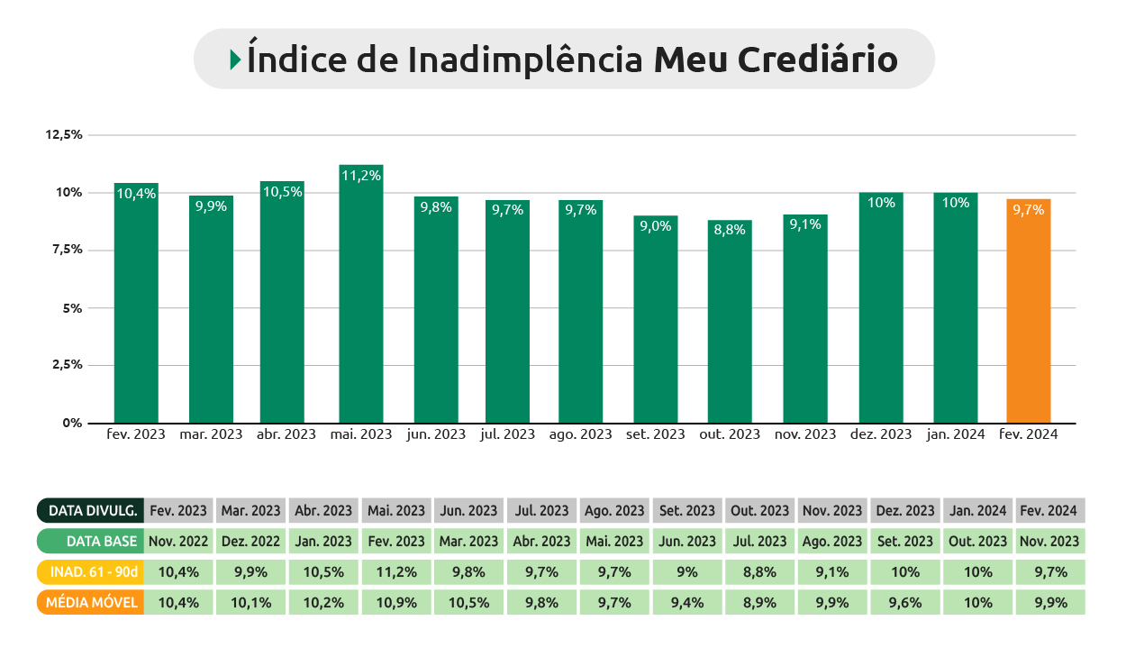 O Índice Meu Crediário, calculado com grau de confiança de 95% e margem de erro de 3%, é uma referência confiável para o varejo brasileiro, pois analisa redes de lojas de todo país. Ele oferece insights valiosos para que gestores do varejo ajustem suas estratégias e enfrentem os desafios econômicos com maior segurança. Acesse aqui os números da inadimplência dos meses anteriores.