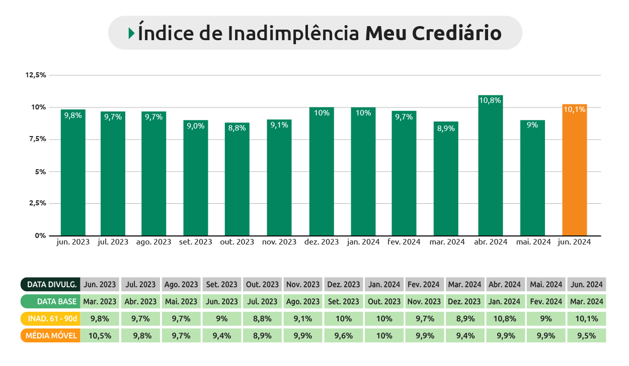 O mercado varejista brasileiro continua enfrentando desafios no cenário de inadimplência. Os dados mais recentes do índice de inadimplência do Meu Crediário, referentes às vendas no crediário realizadas em março de 2024 e vencidas em junho baseadas em cerca de 200 redes varejistas do Brasil, revelam uma taxa de inadimplência de 10,10%.