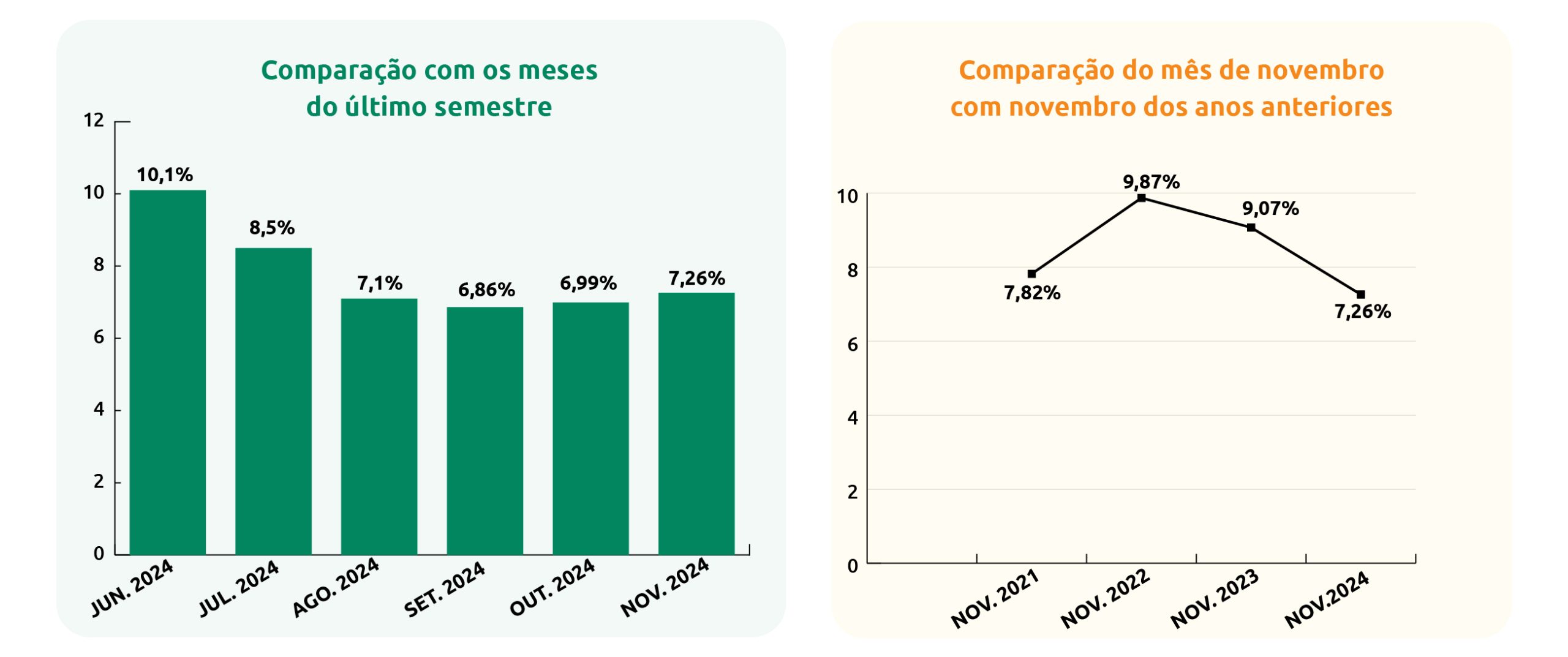 Além disso, comparando com out/23, percebe-se uma redução de 0,25 ponto percentual na inadimplência, que estava em 9,97% no mês anterior.